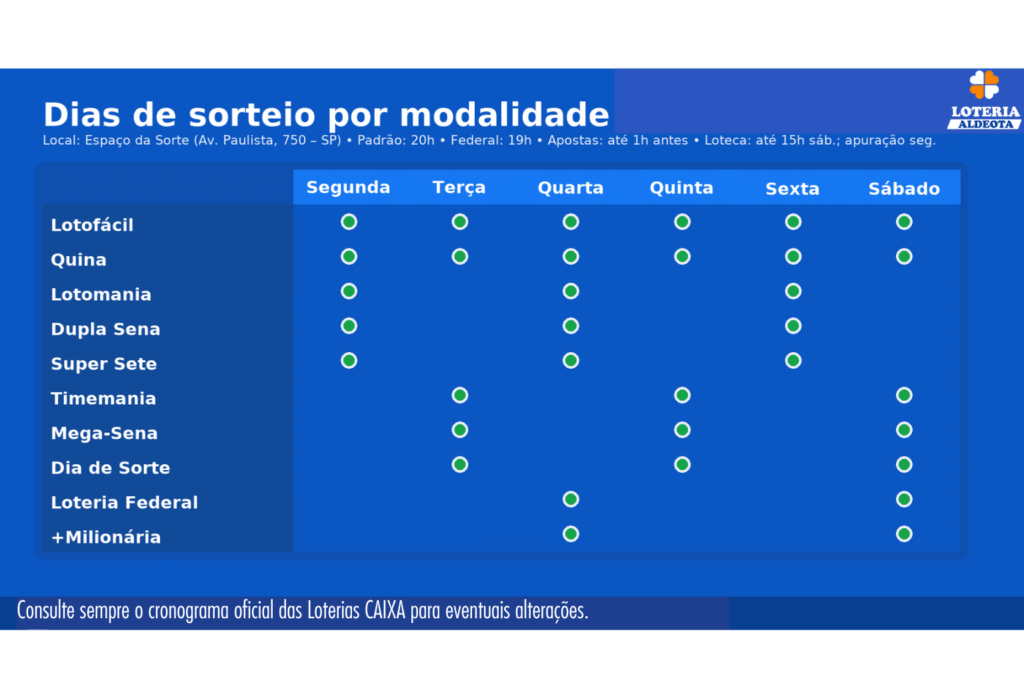 Os concursos são realizados no Espaço da Sorte (Av. Paulista, 750 – São Paulo/SP), com transmissão ao vivo pelos canais oficiais. A regra de horário é a partir das 20h; a Loteria Federal é a exceção e começa às 19h nos seus dias. Para as modalidades numéricas, as apostas encerram 1 hora antes do sorteio. A Loteca tem dinâmica própria: apostas até 15h do sábado e apuração na segunda-feira (ou no dia útil seguinte).