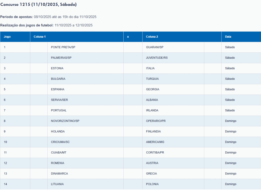 A grade semanal com os 14 jogos, prazos e horários está disponível na página Programação Loteca. Verifique sempre o horário-limite para apostar e a data de apuração.