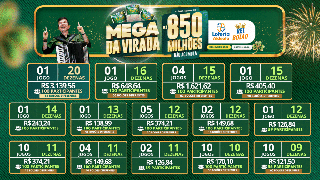 Com os bolões da Loteria Aldeota, você participa de jogos com várias dezenas e aumenta suas chances de ganhar na Mega da Virada de forma significativa, sem precisar investir sozinho em apostas de alto valor.