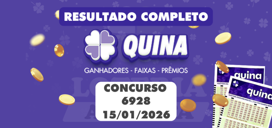 O Resultado da Quina 6928 é apurado às 21h, com o sorteio no Espaço da Sorte, em São Paulo, e transmissão ao vivo pelo canal das Loterias Caixa no YouTube. Confira os números e os detalhes do concurso 6928.